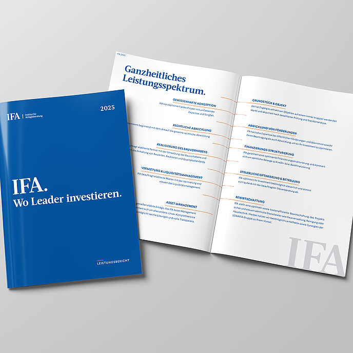 Mit rund 500 realisierten Projekten ist IFA Marktführer für Immobilieninvestments und steueroptimierte Anlagemöglichkeiten. Für mehr als 8.000 Investor:innen verwaltet IFA rund 4,1 Mrd. Euro.