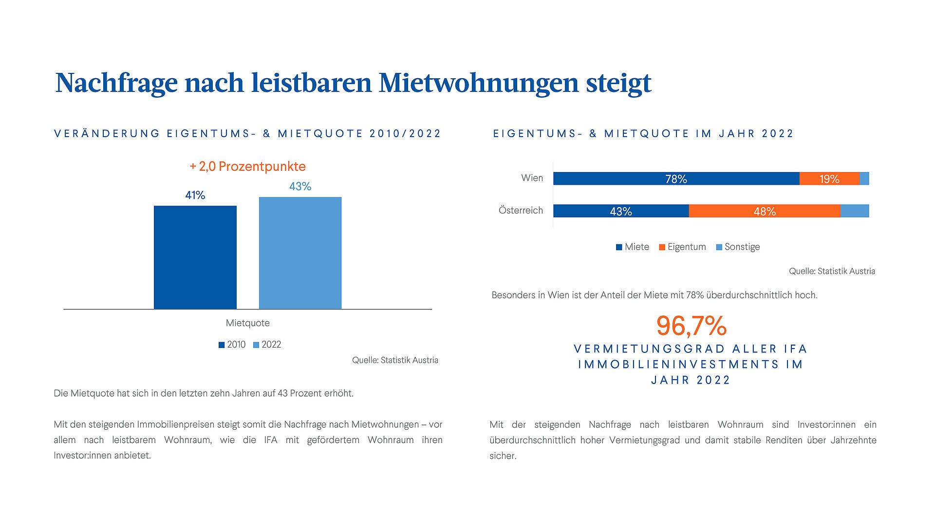 Die Mietquote hat sich in den letzten zehn Jahren in Österreich auf 43 Prozent erhöht. Besonders in Wien ist der Anteil der Miete mit 78% besonders hoch.
