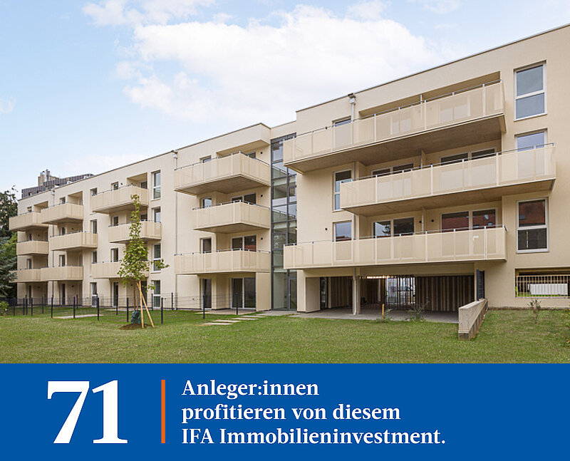 IFA Investor:innen haben sich über ein Bauherrenmodell mit insgesamt 10,45 Mio. Euro beteiligt. Sie profitieren von stabilen, inflationsgeschützten Mieteinnahmen und beständigen Cash-Flows. Dank steuerlicher Optimierungsmöglichkeiten erhöht sich die persönliche Rendite zusätzlich. Durchdachtes Service ermöglicht das Rundum-Paket der IFA, es umfasst alle Meilensteine eines Immobilieninvestments bis hin zu Vermietung, Asset Management und laufender Investor:innenbetreuung.